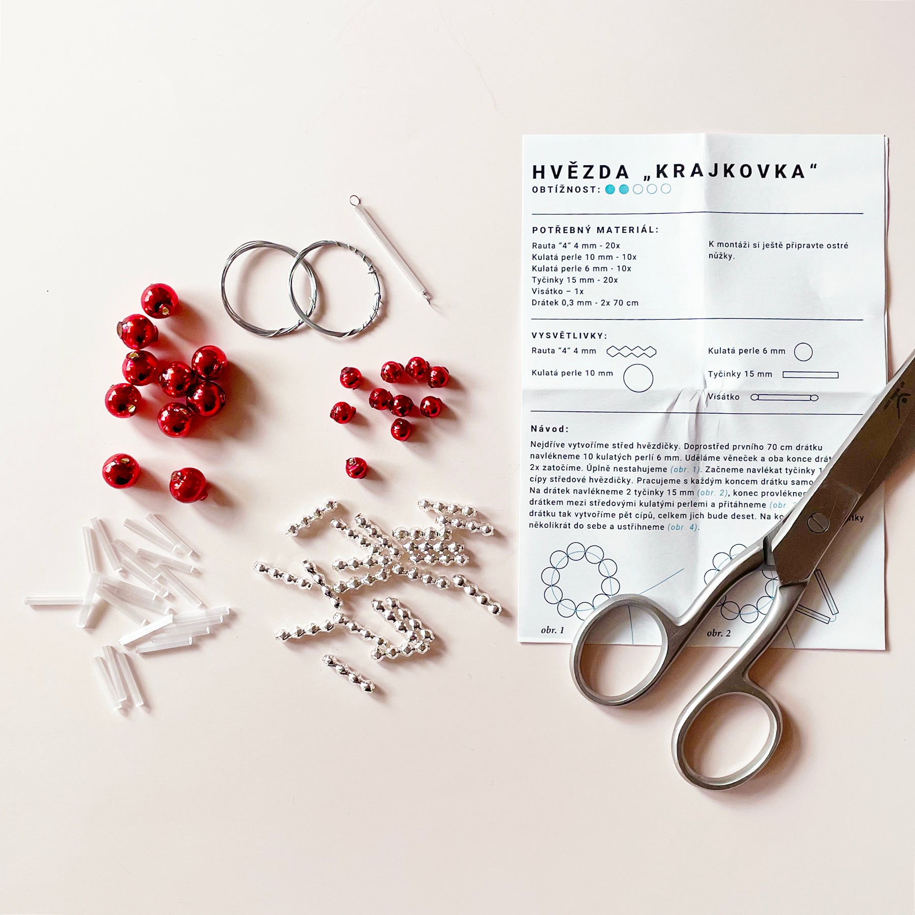 Kit includes everything you need to make one ornament, including illustrated instructions with text written in Czech. We've translated them for you in our Let's Make a Lace Star Ornament blog post! You will also need a pair of scissors.