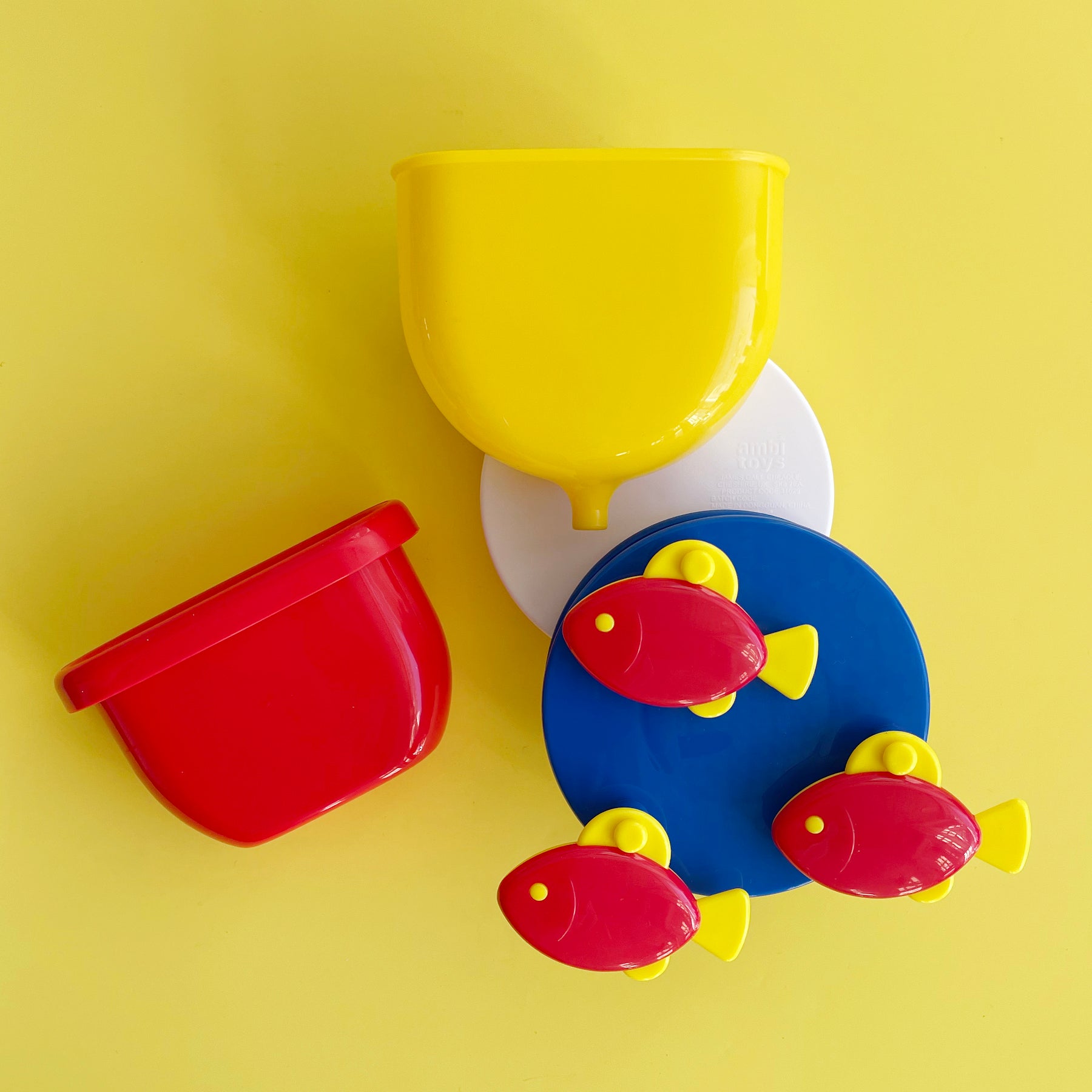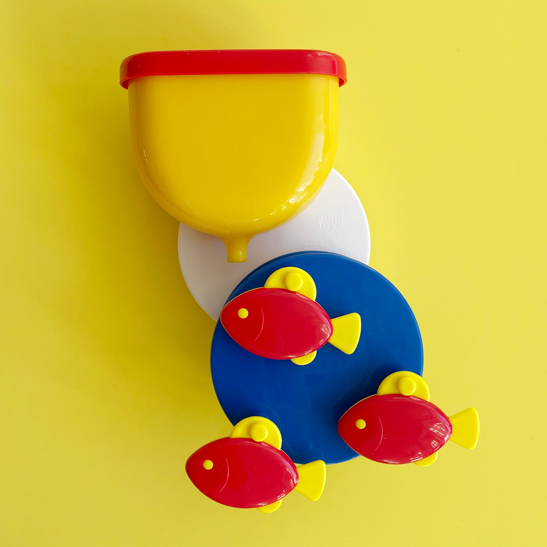 Pour in the water and watch the pretty fish spin around merrily on the wheel. The fish wheel also comes with a detachable water scoop providing lots of bath time fun for parent and child! Made of smooth Plastic, 8.5 inches high. Colors vary between red fish and yellow fish.