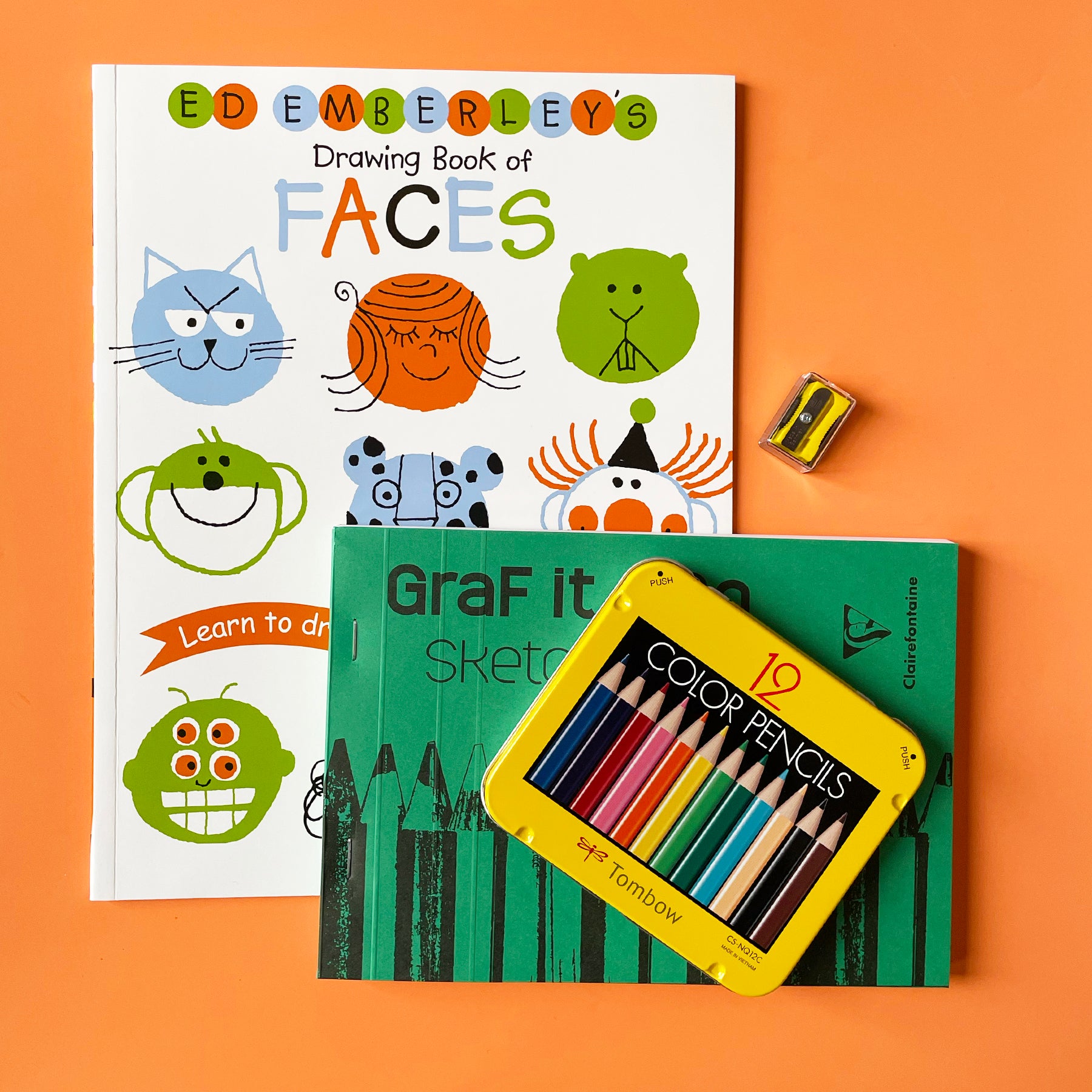 Everything you need to get drawing the Ed Emberly way! This classic and super easy to follow book is so rewarding for kids and adults alike. This bundle also includes a simple sketch pad and a great little set of colored pencils that includes a sharpener!