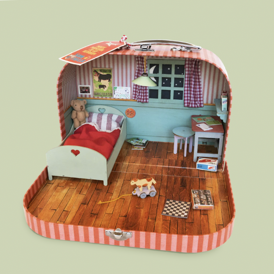 Dive into the world of imagination with this little room to go! Includes all the little pieces you need to craft a miniature bedroom that you can fold up and take with you! Includes laser-cut wood pieces designed to be decorated and assembled to create tiny furniture, paper die-cuts to make mini books and games, little stickers to decorate the walls, and even a tiny teddy bear - all at 1:12 scale!