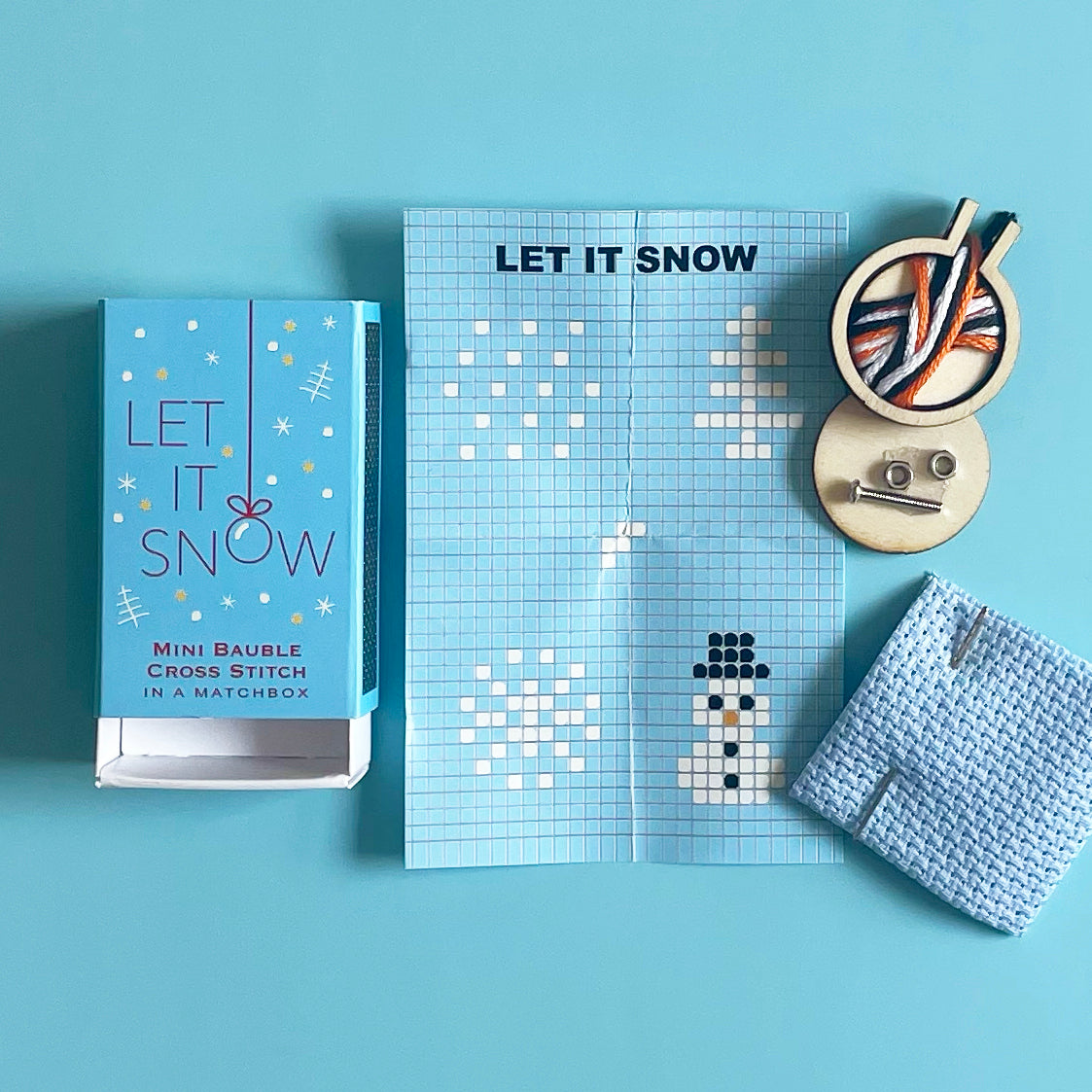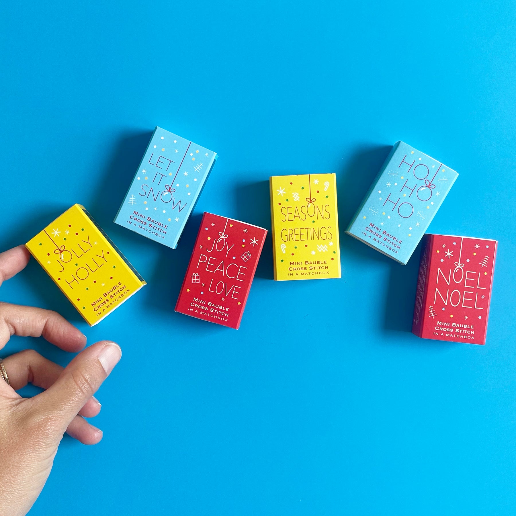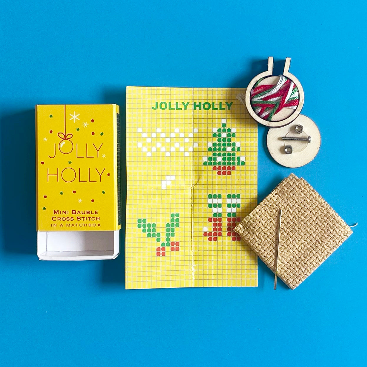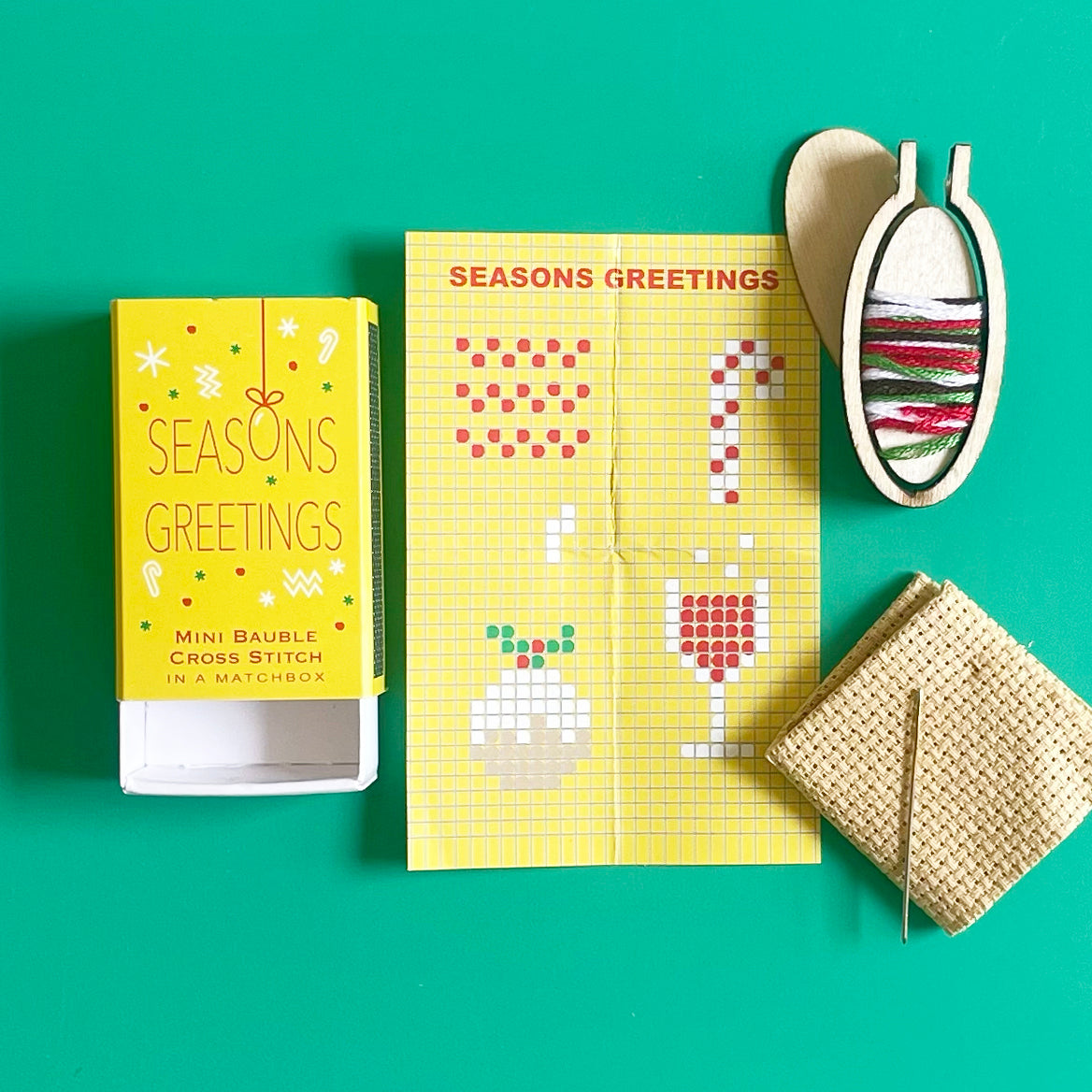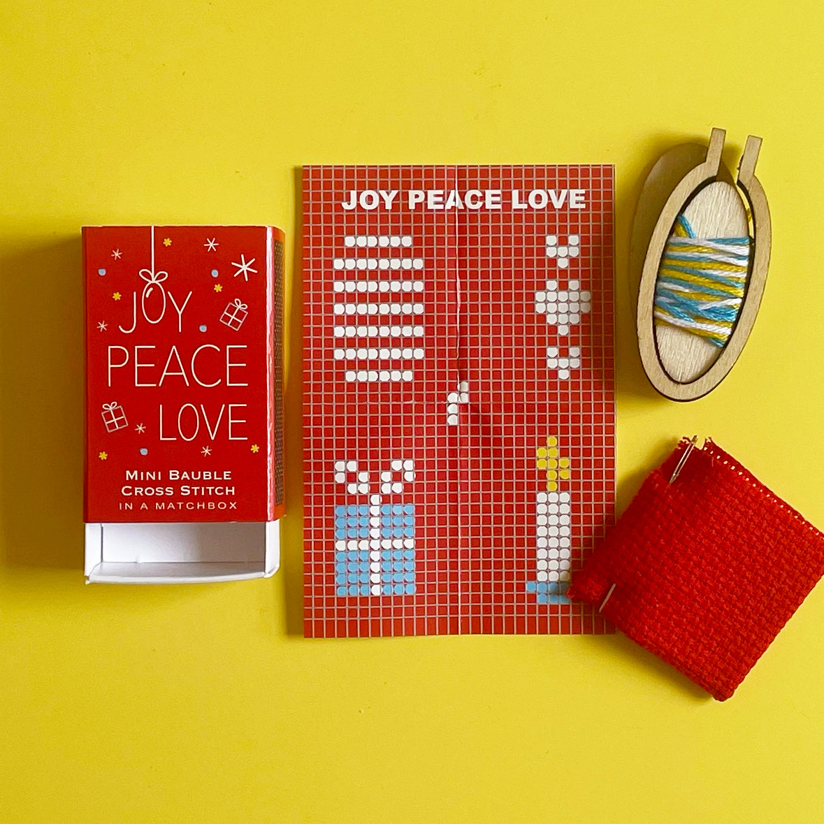 Get stitching with this adorable mini cross stitch kit! Includes patterns for 4 different Christmas-themed designs, plus a teeny tiny hoop to turn your work into a mini ornament when you're finished! Everything you need comes packaged in this miniature matchbox: Instructions, floss, needle, fabric, a charted pattern, and even a teeny tiny hoop.