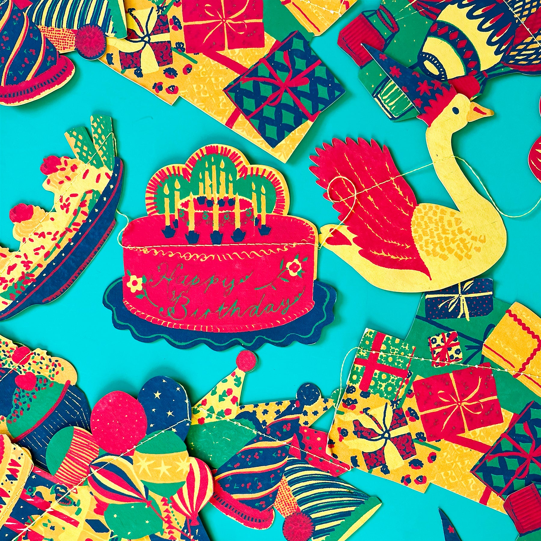 This birthday garland brings the birthday cheer! It unfolds to create three meters of shapes, printed on both sides of thick handmade paper.