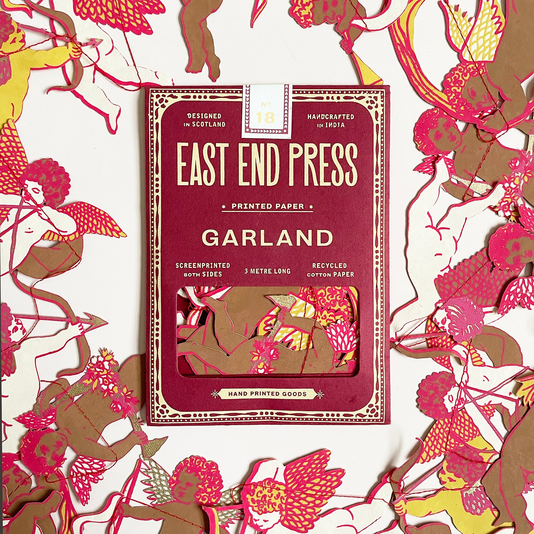 This vintage-inspired garland is ready to party! Twenty angelic cupids fly along this garland, ready to shoot their arrows, and spread the love! Hand printed on luxurious, textured papers on both sides. Garland is 9.75 feet long.