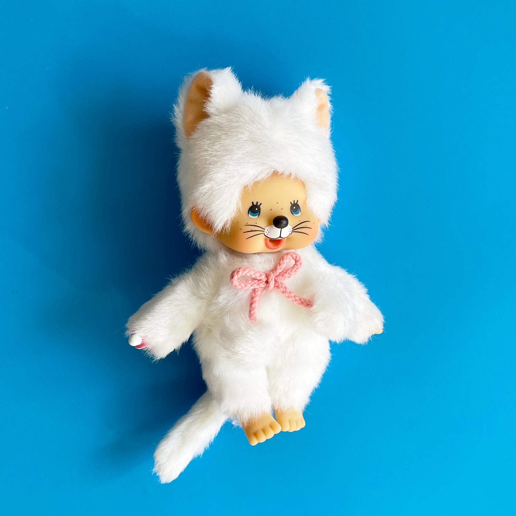 Meow, meow! This sweet Monchhichi is disguised as an adorable white kitten. Made entirely of white fur, with kitty-cat ears and a pompom bow, this trickster cat is as sweet as they come! This classic toy has been keeping kids company since 1974, with its cheeky little smile and suckable thumb! 8 inches tall.