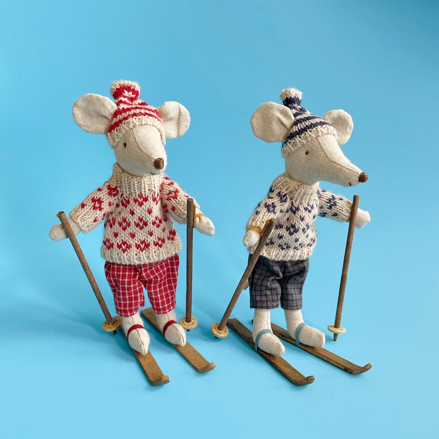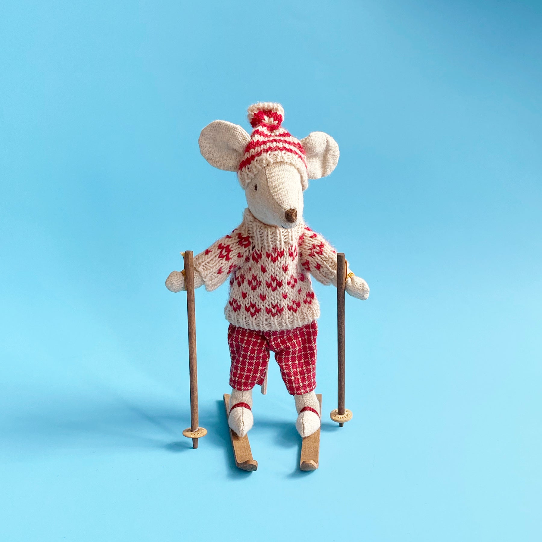 Mum and Dad Mouse is all bundled and ready for a day on the slopes and lots of wintertime fun! She has a knit sweater, cozy checked pants, a pair of skis and poles, and even a little knit cap to keep her ears warm!