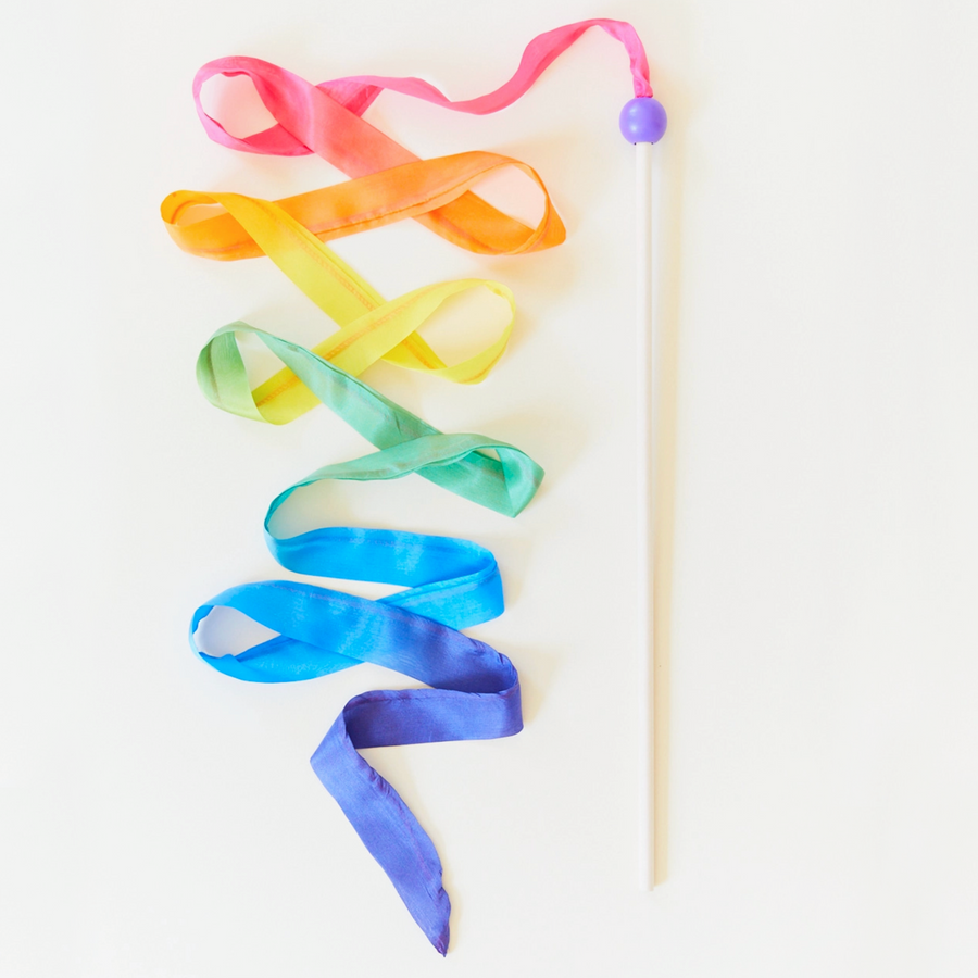 Wood wand with a purple ball topper and a long, luxurious rainbow silk streamer. Streamers encourage children to play actively, increase their quality of movement, and make them want to dance! Go full fairy with the Rainbow Princess Hat!