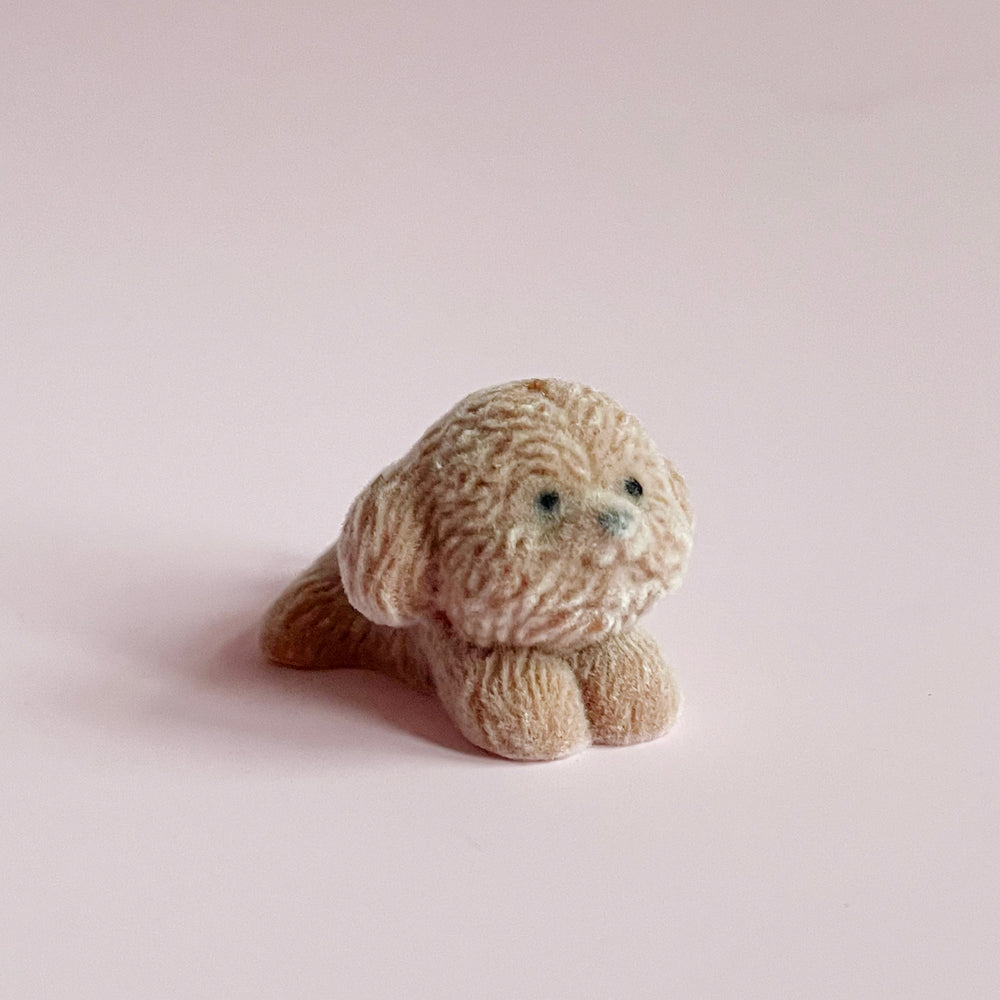 A row of six miniature cotton rabbits with colorful bodies are artfully scattered across a bright yellow background.