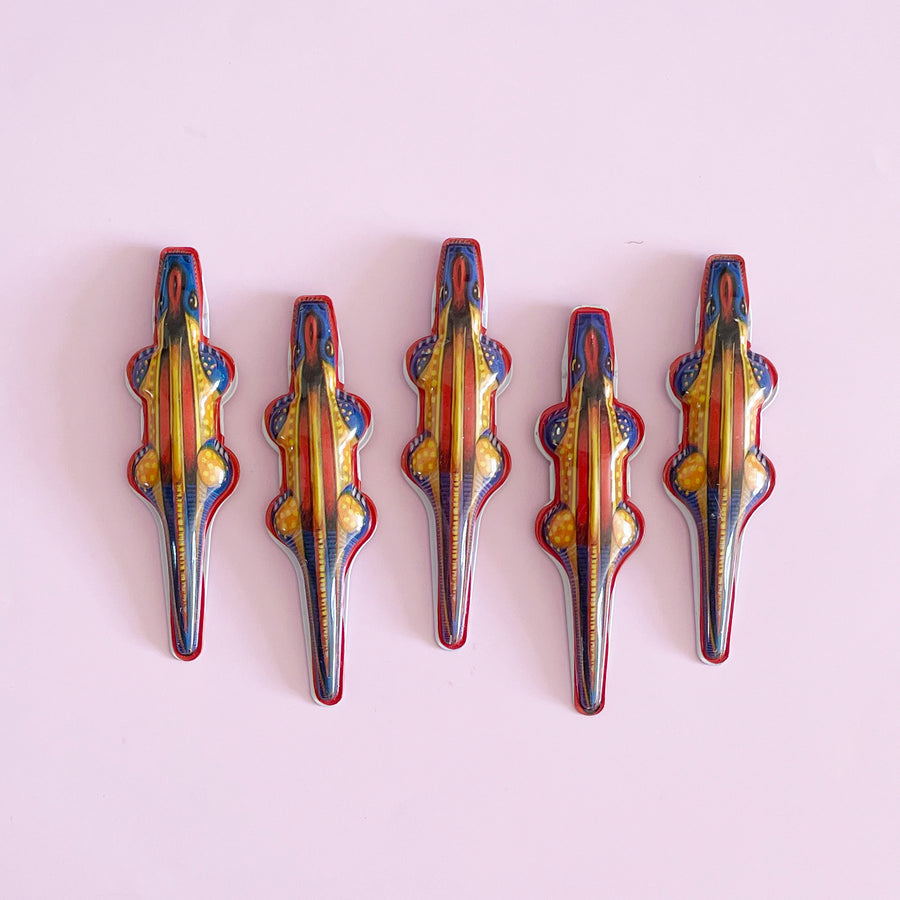 Create an army of clicking crocs with these vintage re-issue tin toy clickers! 5 inches long.