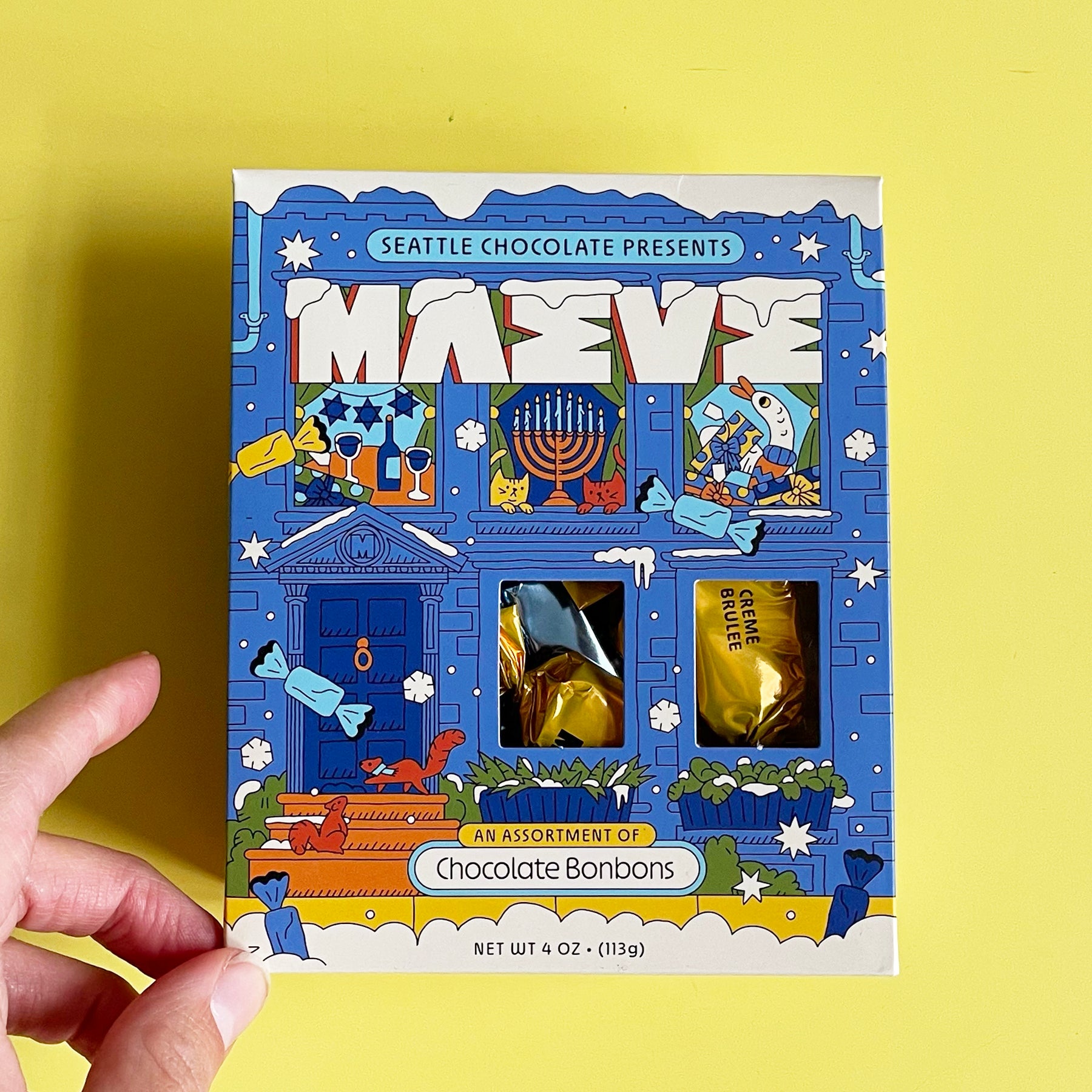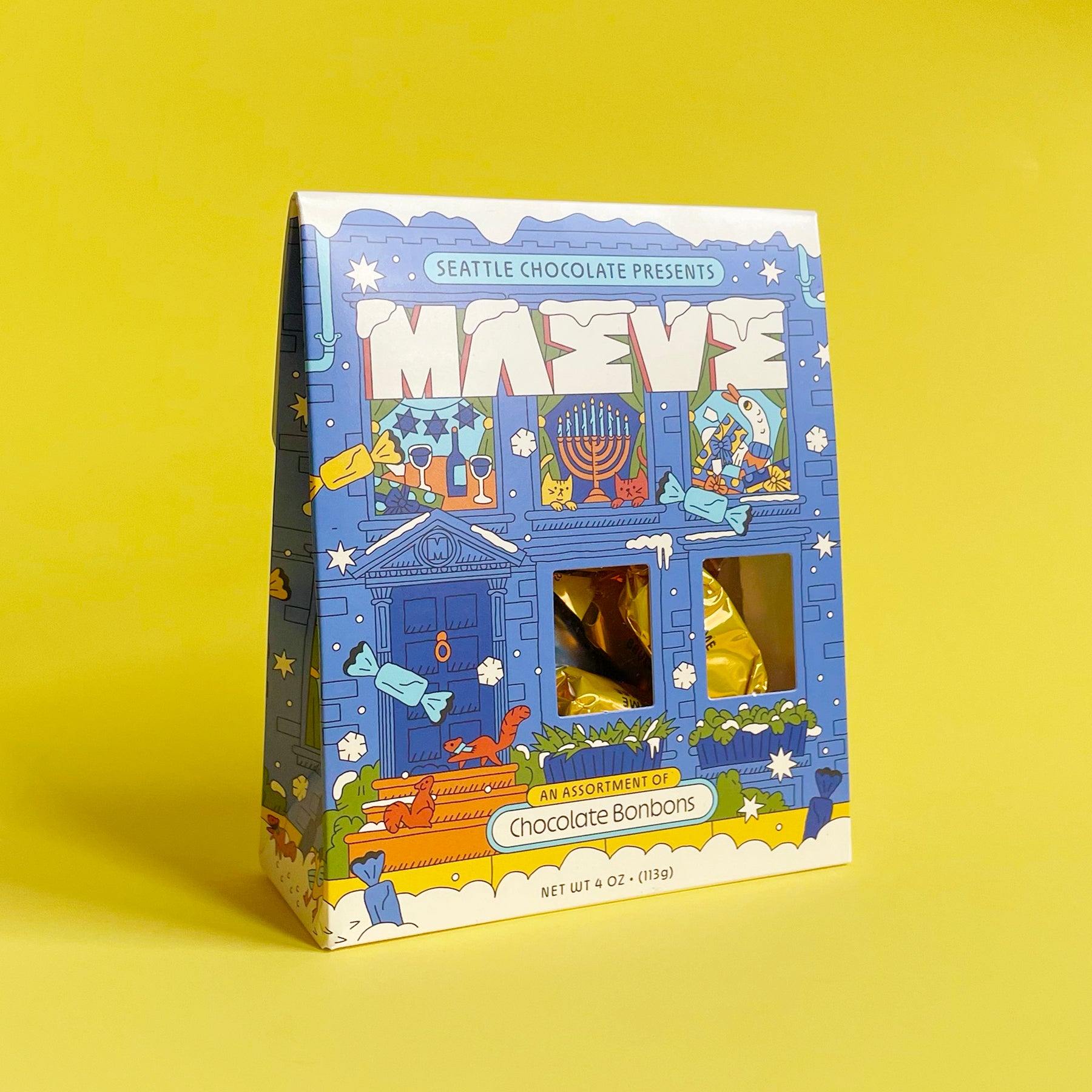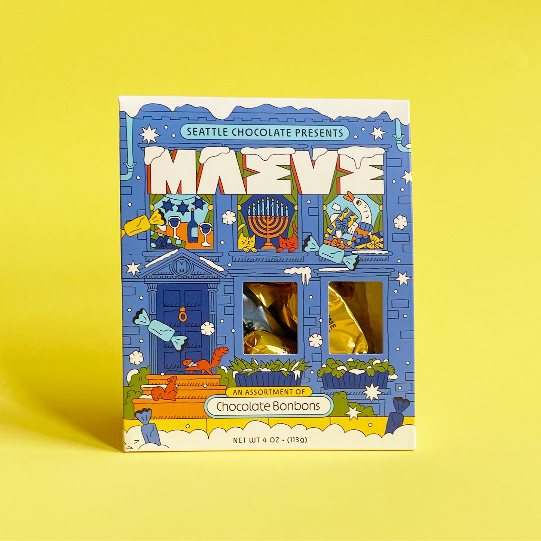 A chocolate for every night of Hanukkah, and then some! This stylish box includes 12 pieces of chocolate goodness in 3 delicious flavors: Coconut Island, Creme Brulee, and Dark Salty Toffee. A perfect host gift, or Hanukkah surprise.