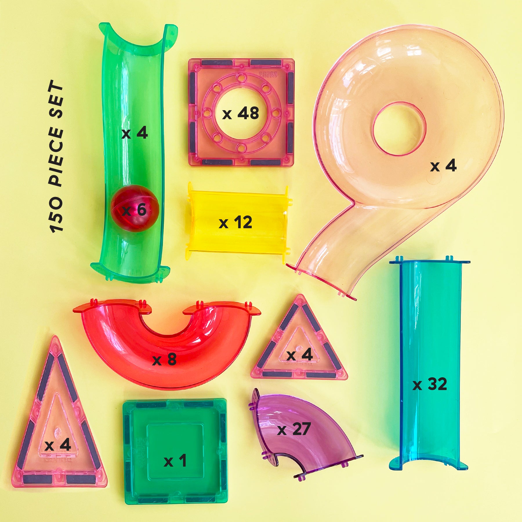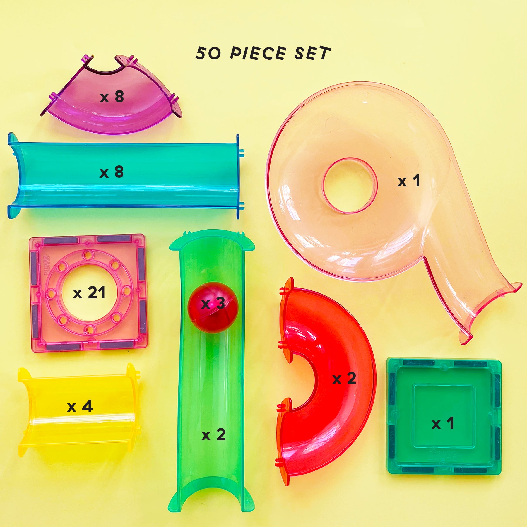 Each kit comes with an impressive collection of magnetic and click-able shapes, and a handful of oversized, 1-inch marbles. (Photo of assembled run shows 25 pieces from the 50 piece set).