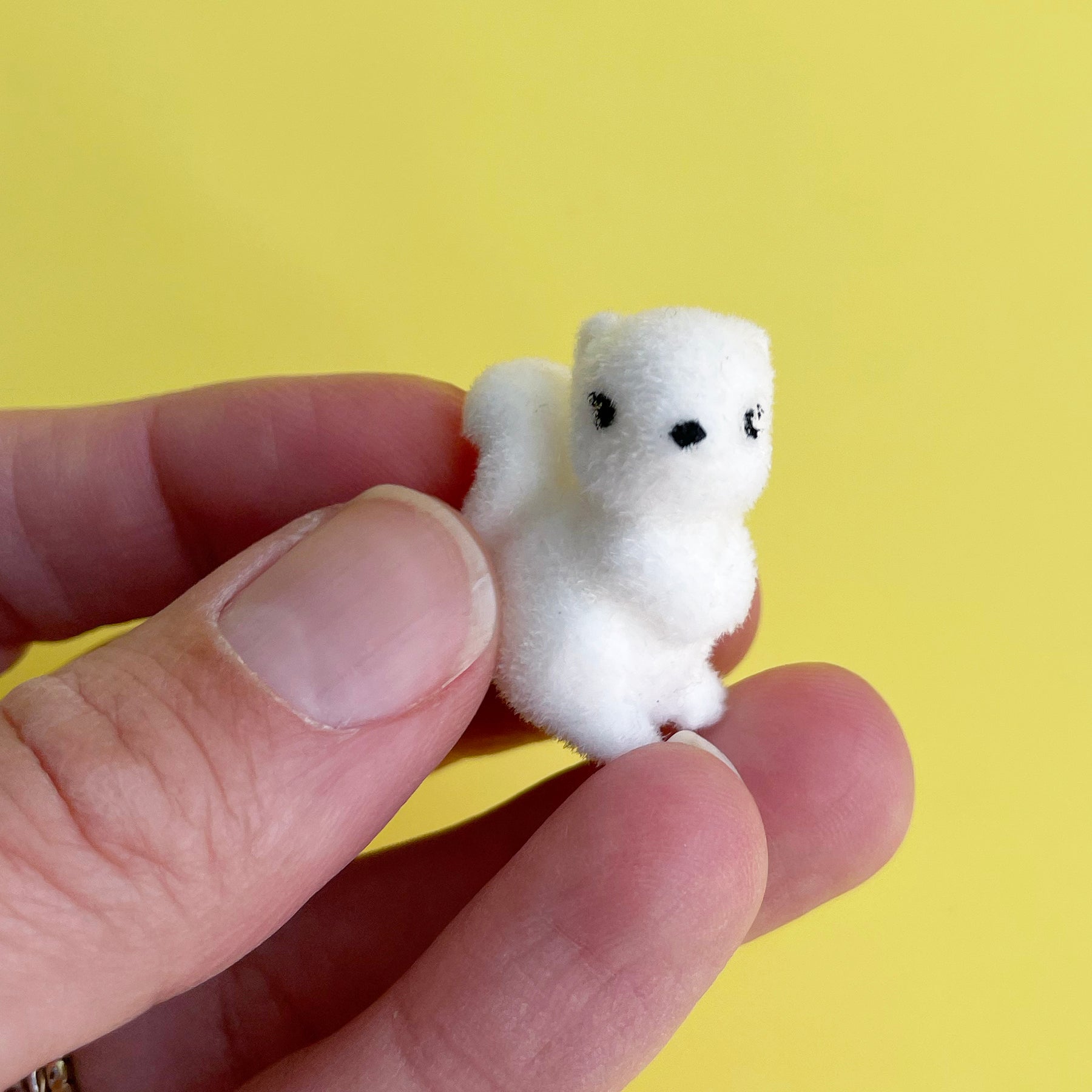 A miniature flocked squirrel ready to adorn a winter scene, fill a dollhouse playroom, decorate your shelf, or travel with you as a constant companion. No matter where she ends up, you won't regret it! Each animal is about 1 inch tall.